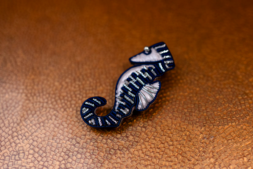 Chaque broche est brodée à l’aiguille ou au crochet de Lunéville avec des matériaux nobles : cannetille, jaseron, paillettes, fil d’or ou fil métallisé de haute qualité. Les motifs sont travaillés avec minutie pour capter la lumière et offrir du relief. Aucune pièce n’est identique : chaque broche est une création artisanale unique.